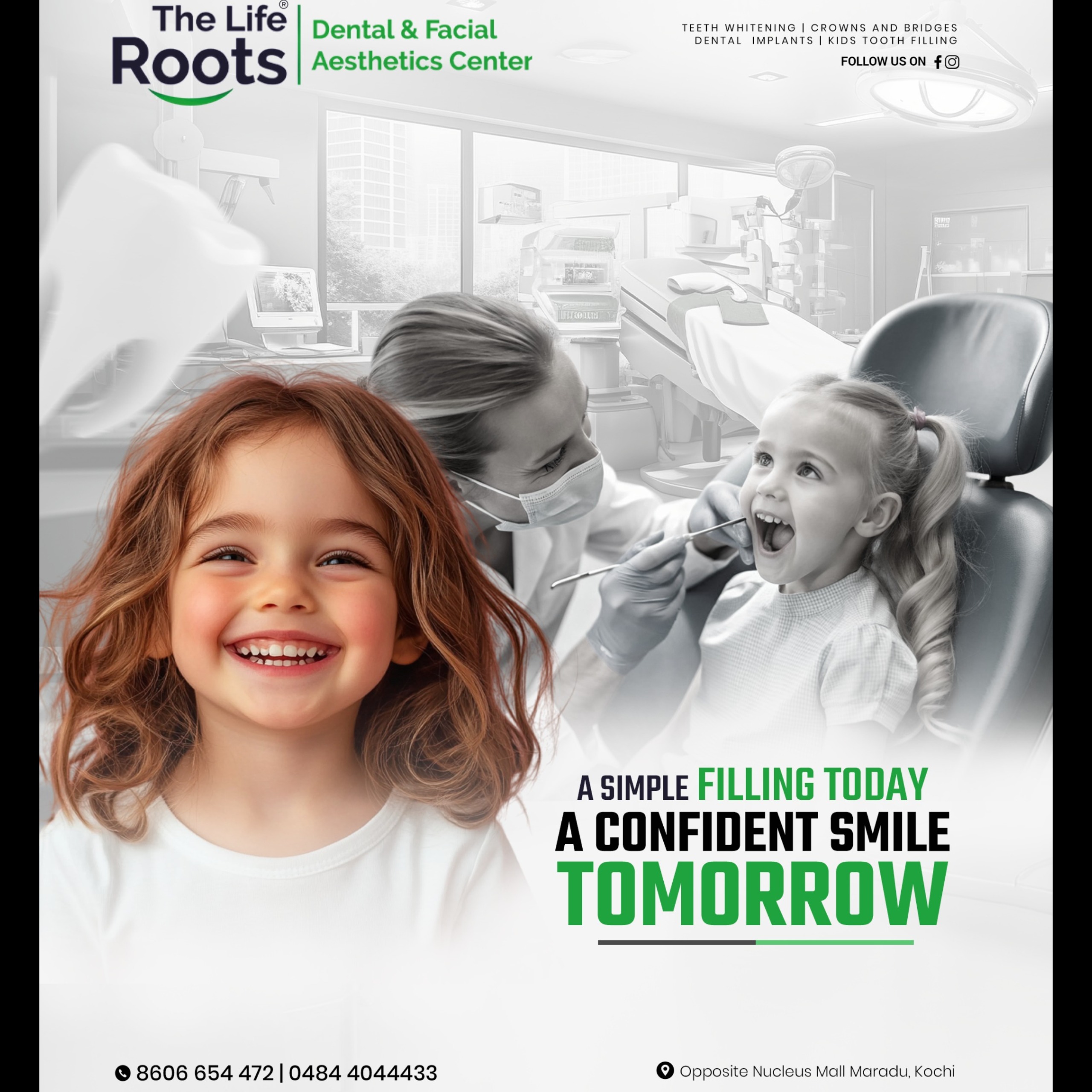Your child’s smile deserves the best care! 💖 At THE LIFE ROOTS DENTAL AND FACIAL AESTHETIC CENTER, Kochi, our expert dentists make dental fillings for kids quick, comfortable, and stress-free. We use tooth-colored, child-safe materials to treat cavities, protect baby teeth, and ensure healthy growth — all in a calm, caring environment. Why parents trust us: -Painless & gentle treatment -Kid-friendly clinic atmosphere -Experienced pediatric dental specialists -Durable, natural-looking fillings Keep your child’s smile bright and cavity-free! Call us today or book your appointment online.