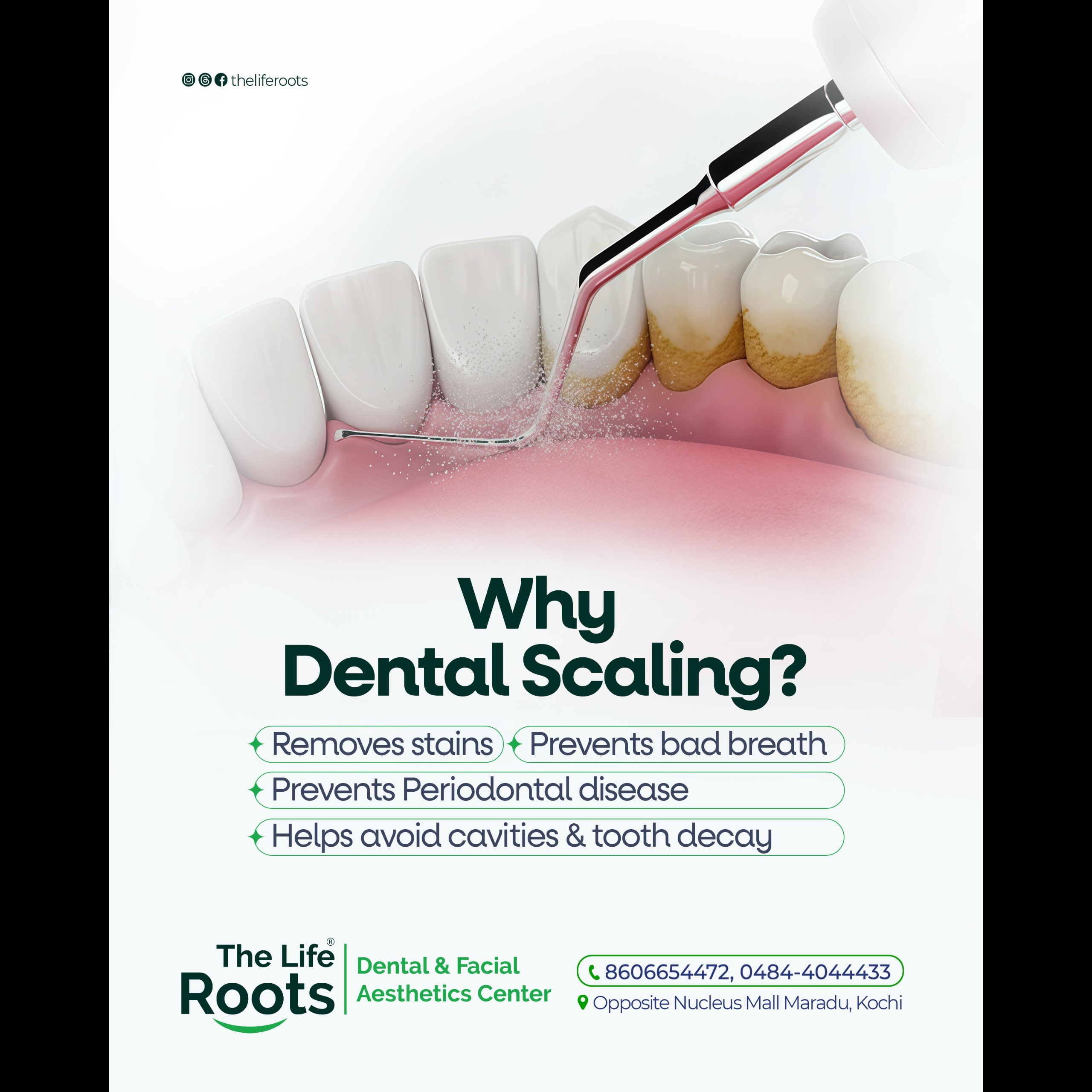 DENTAL SCALING NEEDS TO BE DONE ATLEAST EVERY 6 MONTHS FOR GOOD ORAL HYGIENE.REGULAR CHECK UPS PREVENT DENTAL DECAY TO PROGRESS INTO ROOT CANAL TREATMENTS. YOUR ORAL HEALTH ARE IN SAFE HANDS.YOU CAN GET THE PAIN-FREE TREATMENTS TO YOUR SATISFACION AT THE BEST DENTAL CLINIC IN KOCHI -THE LIFE ROOTS DENTAL AND FACIAL AESTHETICS CENTER