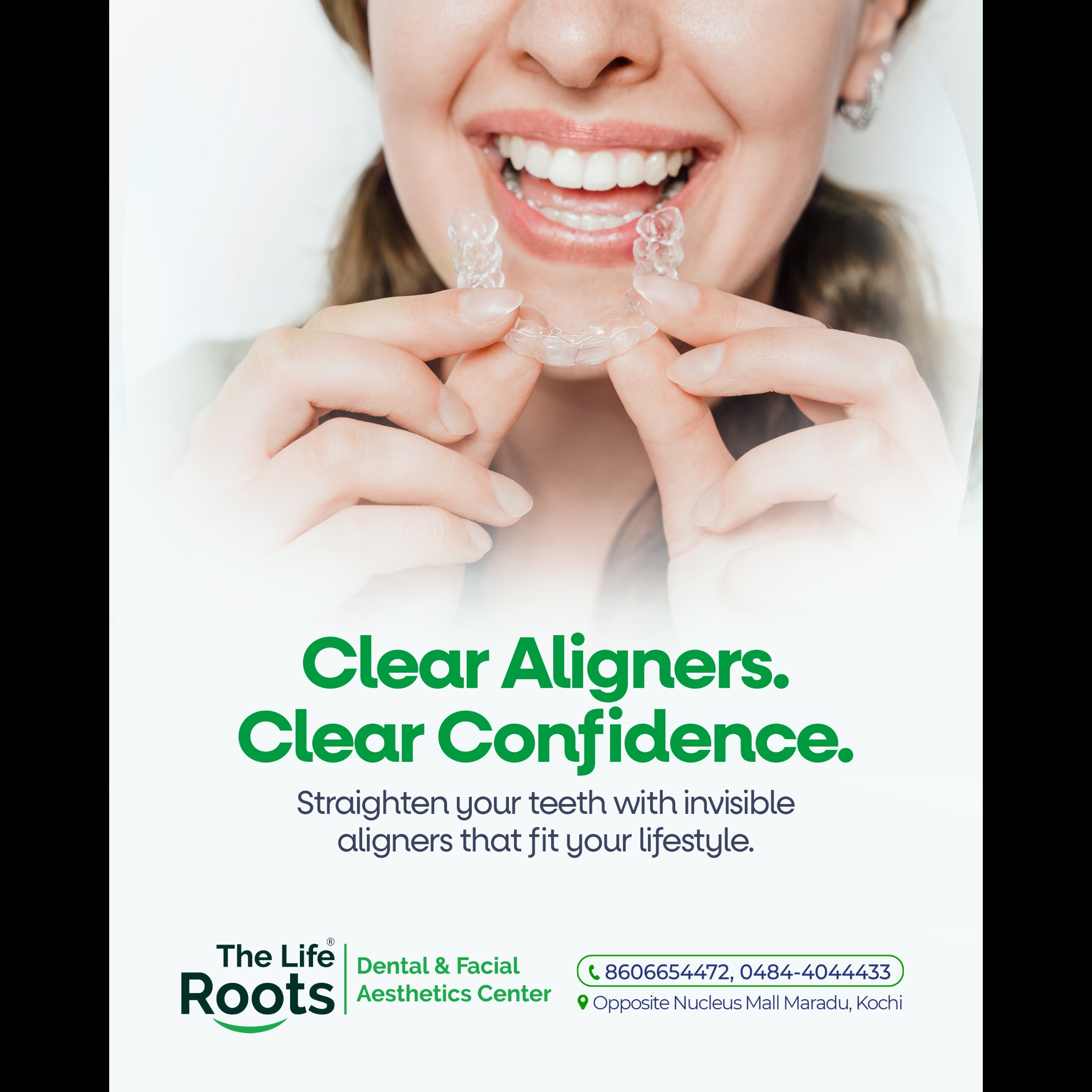Dreaming of a perfect smile without braces? Try clear aligners at The Life Roots Dental and Facial Aesthetic Center, Kochi! They’re invisible, comfy, and designed just for you. Get ready to smile freely and confidently — your dream smile is just one step away! Book your consultation today. #clearalignerskochi #theliferootsdental #smiletransformation #kochidentist